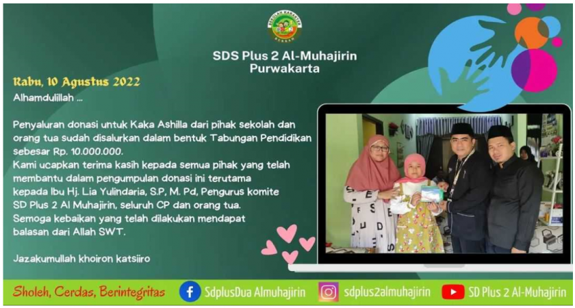 Pemberian santunan tabungan pendidikan kepada ananda Ashilla dari kelas 4 Sana'a SD Plus 2 Al Muhajirin dari pihak sekolah, pengurus komite, seluruh CP dan orang tua siswa Rabu 10 Agustus 2022.